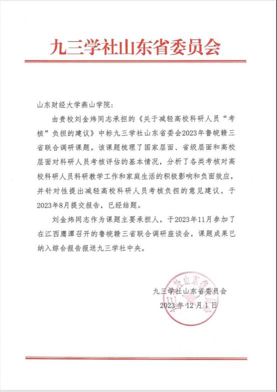 日前,九三学社山东省委员会对2023年度在参政议政方面履职取得突出成绩、作出突出贡献的先进集体和先进个人予以表彰。山东财经大学燕山学院工商管理学院教师刘金炜获得“参政议政工作先进个人”荣誉称号。